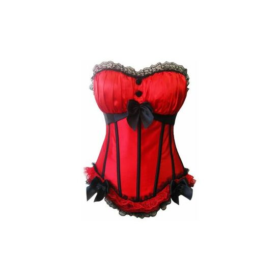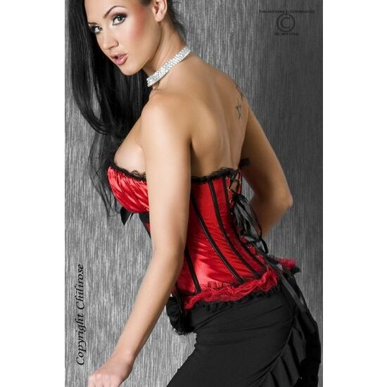 Atractivo corset sexy de satén disponible en colores rojo o negro, con sujetador de corte palabra de honor con aros y tirantes desmontables. Se caracteriza por tener en el pecho doble textil plisado, con detalle de volante de encaje en la parte superior. Las ballenas salen desde debajo del pecho con acabado de lazos y puntilla negra. Este corset sexy de satén se abrocha mediante cremallera en el lateral y lazada trasera de raso.