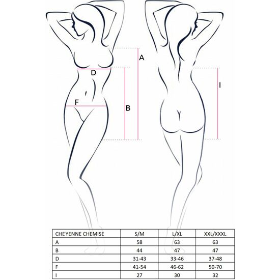 NOTA: La tabla de tallas indica las medidas en centímetros, siendo las letras D y F la medida de bajo pecho y cadera respectivamente, pero no del contorno. Para saber el contorno, se debe multiplicar por 2.