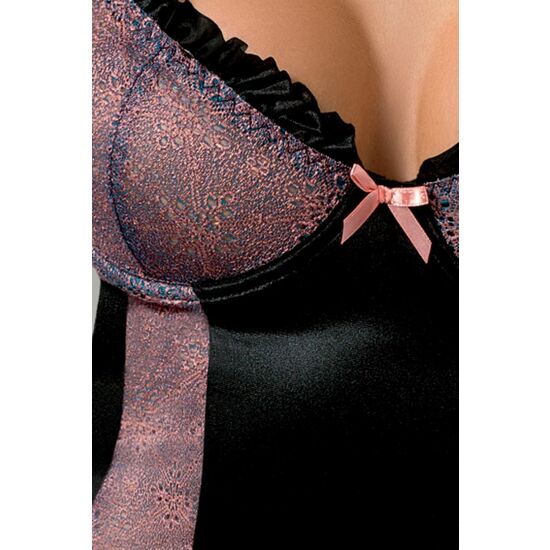 Babydoll erótico de raso negro combinado con encaje en tonos pastel (coral y turquesa).