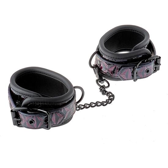 Un par de elegantes esposas de tobillo hechas de material de aspecto de cuero con un diseño estampado negro y púrpura elegante y brillante. Tienen todos los herrajes de níquel negro y están forrados con un material suave y duradero de neopreno para un juego sexy y cómodo. Las esposas de tobillo son totalmente ajustables con los simples hebillas de estilo cinturón. Una cadena de 12 cm de largo mantiene las esposas juntas. La cadena es desmontable por un lado con un gancho mosquetón. Es posible conectar más cadenas o ganchos de cuerda o pesos adicionales. Estilosas esposas Totalmente ajustable con la simple hebilla de estilo cinturón Unidas por una cadena negra que puedes conectar fácilmente con cuerda, ganchos o pesos Estas duraderas esposas cuentan con todos los herrajes de níquel negro y están forradas con un material suave y duradero de neopreno para un juego sexy y cómodo.