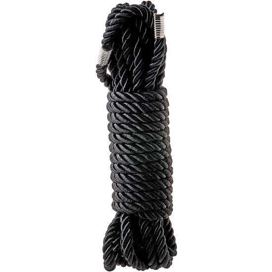 Cuerda de bondage negra súper suave con acabado sedoso, 5 metros de largo. Ambos extremos tienen un acabado anti-deshilachado de metal. Esta es una cuerda versátil para múltiples opciones de atado. Es ideal para aquellos nuevos en el juego de bondage estilo japonés, así como para aquellos más experimentados en Kinbaku o Shibari ataduras apretadas.Cuerda de bondage súper suave con acabado sedoso5 metrosExtremos anti-deshilachados