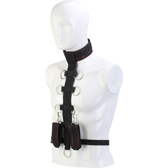 Arnés de restricción corporal con cuello y puños desmontables, cada uno con decoración bordada roja. El arnés se puede usar en la parte delantera o trasera del cuerpo. El cuello y los puños se pueden ajustar en tamaño con cierres de Velcro y son cómodos de usar. La banda de la cintura también se puede ajustar con un cierre de hebilla. Con ganchos de mosquetón, los puños se pueden conectar a cualquiera de los 9 anillos O, que también son adecuados para conectar otros accesorios BDSM como cadenas o pesos adicionales.