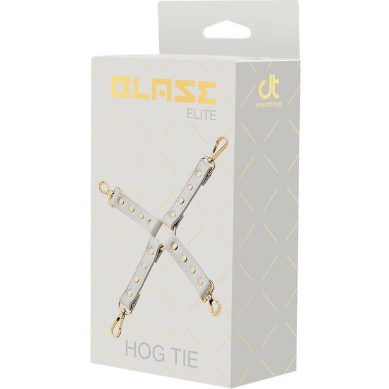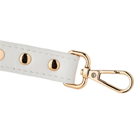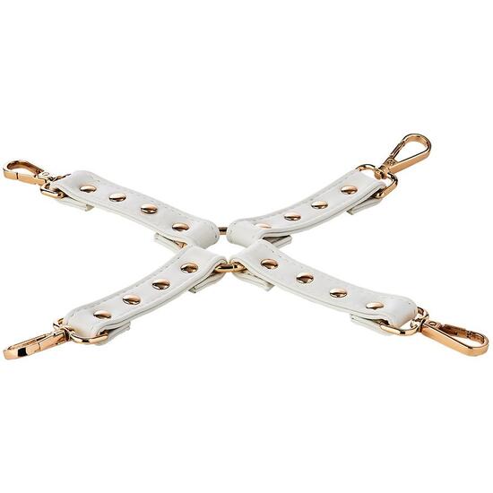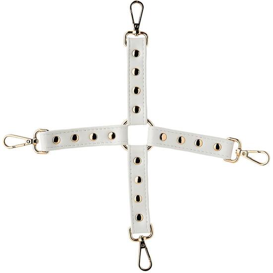 Esta hog tie de la colección Blaze Elite está hecha de cuero artificial blanco con detalles metálicos de color dorado que la hacen lucir muy elegante. Mejora tu juego de bondage con una hog tie para sujetar los brazos y las piernas de tu sumiso. Las 4 ganchos mosquetón se pueden usar para conectar cadenas, cuerdas, esposas, tobilleras y otros accesorios de bondage, por ejemplo, las tobilleras y muñequeras a juego de la colección Blaze Elite. Hog tieHecho de cuero artificial blancoCon detalles metálicos de color dorado, libre de níquelCon 4 ganchos de broche