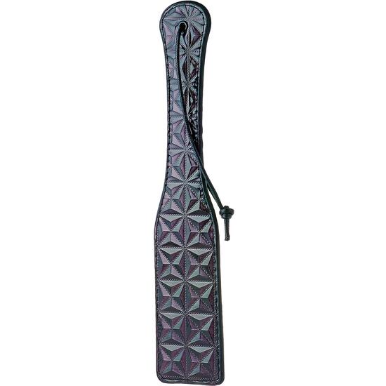 Esta pala para juegos BDSM está hecha de material de aspecto de cuero con un diseño estampado negro y púrpura elegante y brillante en el lado frontal y tiene una parte trasera lisa. Las diferentes texturas causarán diferentes sensaciones. Tiene una cómoda correa para la muñeca. La pala es ligeramente flexible para azotes suaves o firmes, use con cuidado. Paddle liso y con textura. El exterior está estampado con un patrón de diamantes púrpura y negro en un lado y neopreno liso en el otro. El mango tiene un bucle para colgar o para envolver alrededor de su muñeca mientras administra su castigo. Longitud: 32 cm, Ancho: 6 cm.