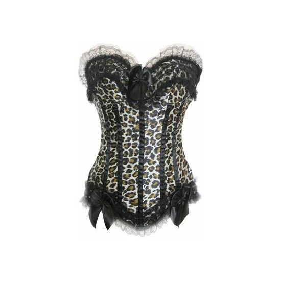 Corsé retro de leopardo de tejido satinado con volantes de encaje negro en la parte superior e inferior. El corset sexy tiene detalles de ballenas y lazos en color negro y se abrocha mediante lazada negra de raso en la zona de la espalda. Incluye tanga de cortesía.