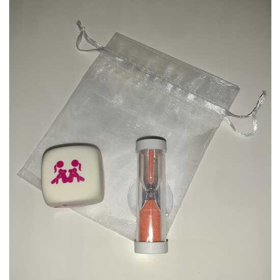- Es un dado blanco, duro y de gran calidad de 25 mm además de un reloj de arena de 2 minutos que te marcará el tiempo de la postura que salga en el dado.