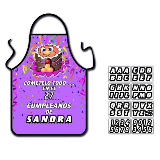 Fantástico delantal personalizable con las letras y los números adhesivos incluidos.