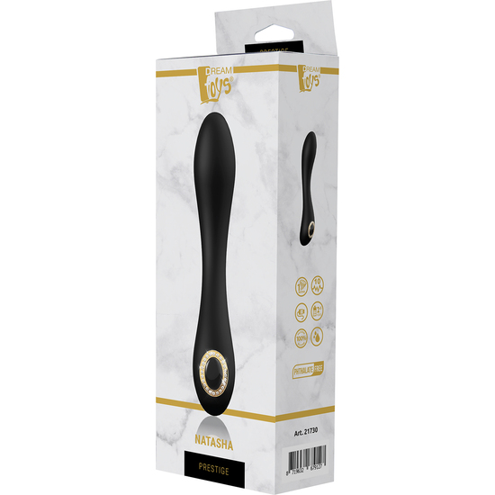 La vibradora Natasha de la colección Prestige de Dream Toys es una vibradora negra con un elegante botón en forma de gema y una cabeza bastante grande y flexible. La parte estrecha en el medio es ligeramente flexible. El potente motor ofrece 7 patrones de vibración y 3 velocidades. La vibradora Natasha es recargable con el cable USB magnético incluido. Está hecha de silicona sólida suave y ABS, es resistente al agua IPX7, segura para el cuerpo, libre de ftalatos y libre de látex. El funcionamiento se puede realizar con el único botón de un toque en la base de la vibradora que se ilumina con luz LED azul cuando se activa. Colección Prestige: Juguetes de silicona negra, equipados con elegantes botones en forma de gema en un anillo de color dorado y un embalaje acorde con impresión dorada y mármol. Vibradora Natasha, parte estrecha flexible en el medio, gran parte superior 1 Motor potente 7 Patrones de vibración y 3 velocidades Fácil control de un solo toque con luz LED azul Recargable, cable USB magnético incluido Tiempo de carga aprox. 2.5 horas Tiempo de juego 1 hora Hecho de silicona suave y ABS Resistente al agua IPX7 Dimensiones: 20,0 cm de longitud (insertable 14 cm), 3,7 cm de diámetro Haga clic aquí para descargar el manual.