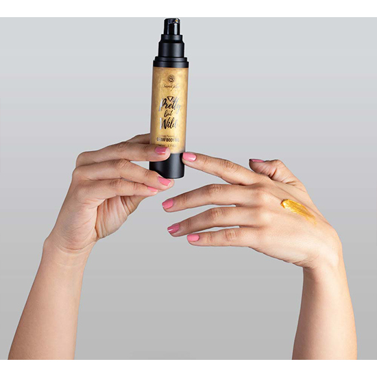 GLOW BODY OIL de la colección PRETTY BUT WILD es un aceite corporal iluminador elaborado con activos vegetales que añade un efecto con destellos y un ligero brillo dorado en la piel dejando la piel luminosa e hidratada.