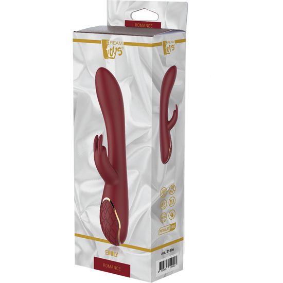 Desde la introducción de la colección Romance de Dream Toys, hemos disfrutado de un gran interés por la gama de juguetes de nuestros clientes y sus clientes, los usuarios. La colección Romance se caracteriza por un color rojo burdeos con acentos dorados que le dan al juguete un aspecto elegante. Por dentro tienen tecnología de alta calidad que ofrece una estimulación intensa con 7 ritmos de vibración y 3 velocidades. La facilidad de uso también es importante, por eso todos son resistentes al agua y recargables. Este duo vibrador con estimulador clitorial en forma de conejo se llama Emily. La caja tiene el estilo típico de Romance: un fondo de satén blanco, acentos dorados, imágenes claras del juguete, una descripción multilingüe en el lado posterior, iconos para una rápida descripción de las funciones y las dimensiones en el panel lateral de la caja. Duo vibrador2 Motores potentes, ofreciendo 7 ritmos de vibración y 3 velocidades para estimulación vaginal y clitoralRecargable con el cable USB magnético incluidoResistente al agua IPX7Haga clic aquí para descargar el manual.