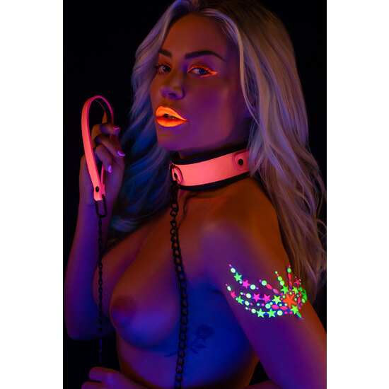 ¡Explora tu lado atrevido! Usa el COLLAR Y CADENA TABOOM CON LUZ EN LA OSCURIDAD en la habitación, en la habitación de un hotel, en una fiesta de juegos o en un club atrevido. Deja que tu dominante de confianza te controle tirando de ti. El collar y la cadena de fácil uso están hechos de materiales de alta calidad y son perfectos para una excelente sesión BDSM. O llevarlo como una sexy declaración de moda. Prepárate para una experiencia de bondage iluminadora con el collar y la cadena de cuero vegano.