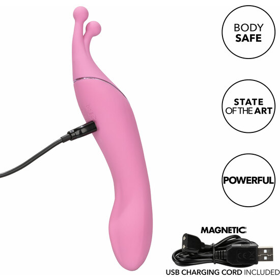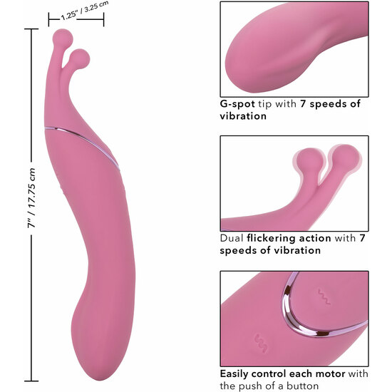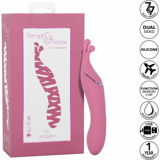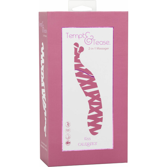 The Tempt and Tease Kiss es un masajeador de doble cara que sabe exactamente lo que anhelas. Sienta cómo aumenta el calor con el estimulador dual con dos puntas exclusivas, dos potentes motores y 7 funciones de vibración controladas de forma independiente. Con una forma versátil y dos potentes motores de vibración en cada extremo, alcanzará nuevas alturas climáticas en poco tiempo.