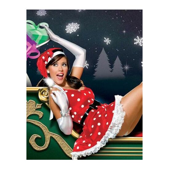 Vestido corto de Navidad de tacto aterciopelado, cogido al cuello, con lunares y ribetes en color blanco. Debajo de la falda tiene un tul acabado en volante de puntilla que sobresale. Incluye cinturón negro, gorro navideño y tanga rojo de cortesía. NO incluye los guantes.