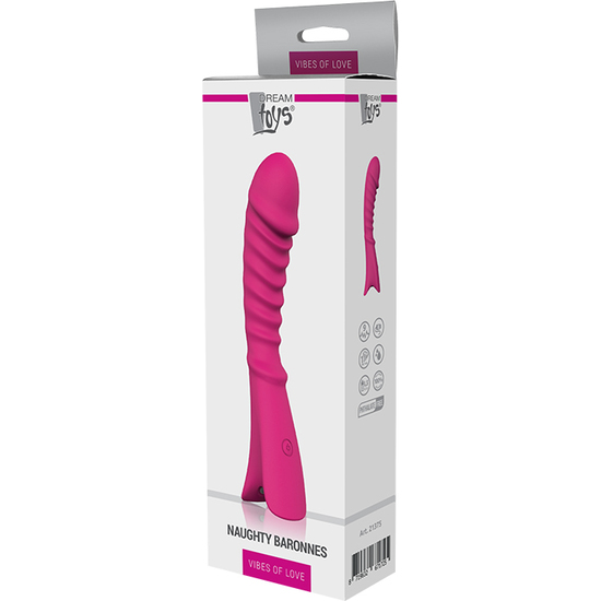 La Baronessa Pícara es un vibrador elegante con una silicona externa agradablemente suave al tacto y con estímulantes costillas en el eje. El potente motor ofrece 9 patrones de vibración, que se operan con 1 botón en la base del vibrador. Vibrador recargable hecho de silicona segura para el cuerpo1 Motor potente que ofrece 9 patrones de vibraciónCarga completa en 1.5 horas, 1 hora de tiempo de juegoLuces intermitentes al cargar. Luz constante cuando está completamente cargadoPresione el botón de encendido para encender la unidadPresione de nuevo para cambiar el programaLibre de ftalatosResistente al agua