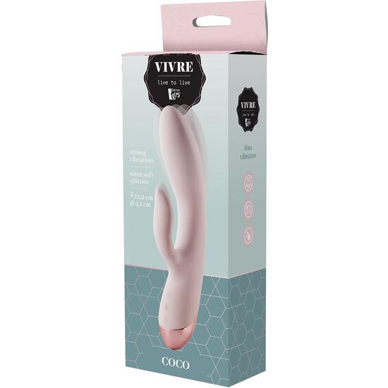 Coco es un vibrador doble hecho de silicona sólida suave y ABS con un cuerpo ligeramente flexible y curvado y un estimulador clitorial flexible. El vibrador doble es seguro para el cuerpo, libre de látex y libre de ftalatos. Cuenta con 2 motores, ofreciendo vibraciones fuertes y profundas, con 3 velocidades y 7 ritmos, por lo que todos encontrarán su configuración de estimulación favorita. El funcionamiento es fácil con 3 botones. El eje y el estimulador del clítoris tienen su propio motor y su propio botón para personalizar la experiencia. Gigi se puede usar en la bañera o en la ducha ya que es completamente a prueba de agua. Se incluye un cable USB-pin para recargar. Vibrador doble 7 ritmos de vibración y 3 velocidades Hecho de silicona y ABS con recubrimiento de PU Libre de ftalatos y látex, seguro para el cuerpo A prueba de agua Recargable, cable USB-pin incluido Tiempo de carga 2,5 horas Tiempo de uso 1 hora Longitud 22,9 cm Ancho 4,1 cm Coco es parte de la línea de juguetes Vivre de Dream Toys. La palabra francesa significa vivir y la gama Vivre está destinada a las jóvenes y sus parejas que aprecian las cosas finas de la vida, que prefieren los colores pastel en lugar de los colores llamativos, mujeres y hombres con un estilo de vida sofisticado que prefieren la calidad a la cantidad. Con su suave color rosa y el acento metálico rosa en la base, el vibrador doble Coco tiene una apariencia elegante y clásica. El empaque a juego ti
